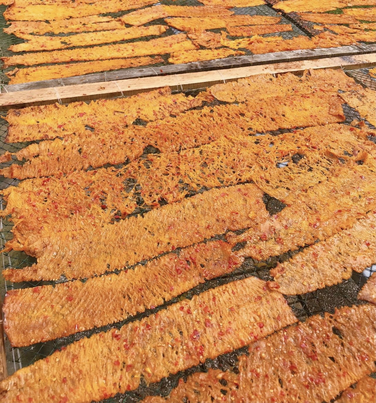 Big size squid is marinated with spices, grilled by fire on a drying rack, then rolled and stamped to reduce toughness.